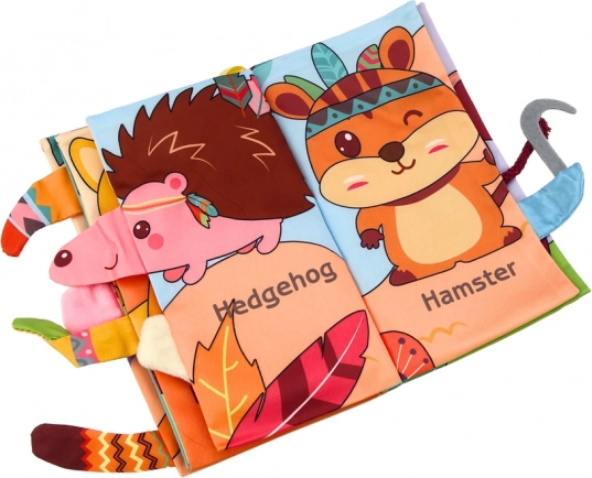 .Det bløde hæfte med dyr er ikke kun legetøj, men et interaktivt udviklingsværktøj til de mindste. Det bløde, raslende materiale og de udstående elementer, såsom dyrenes haler, giver fascinerende sansestimulering, der engagerer sanserne og udvikler hånd-øje-koordination.
