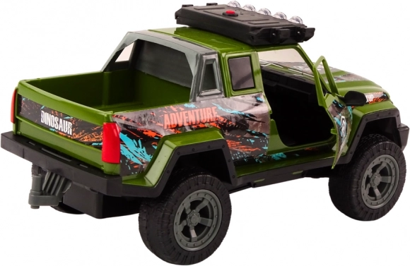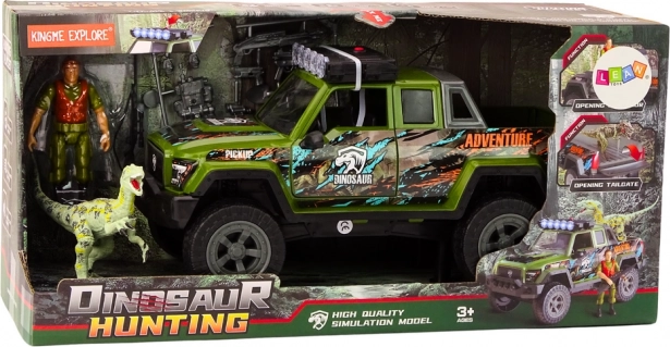Grøn terrængående bil med jæger- og dinosaurusfigurer. Åbnebare døre, realistiske lyde og lys, CE-certificeret.