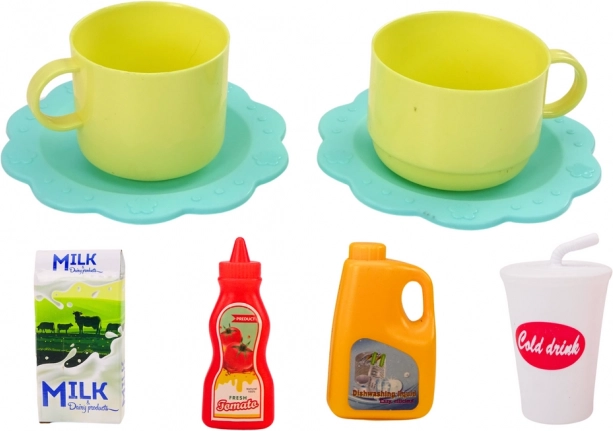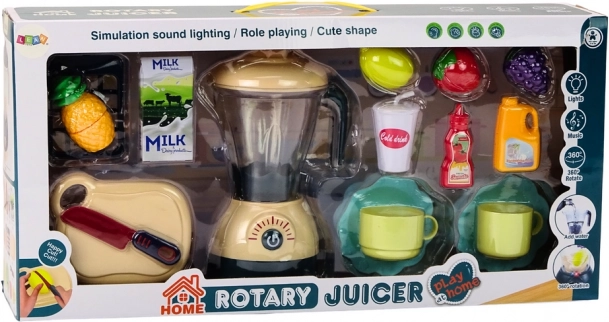 Sjovt køkkensæt til de mindste med en elektrisk blender, der har lys- og lydeffekter samt roterende funktion. Børn kan hælde vand i beholderen og se “cocktailen” hvirvle, skære frugt med velcro med den plastiske kniv på skærebrættet og servere i to kopper med underkopper. Et fremragende valg til udvikling af finmotorik, fantasi og rolleleg i et sikkert design.