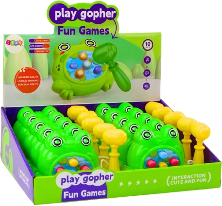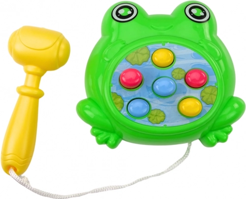 Mini-spillet i form af en grøn frø er en mobil version af klassikeren Wac‑a‑Mole: mål dukker uventet op fra åbninger, og opgaven er at ramme dem så hurtigt som muligt med den medfølgende hammer. De kompakte mål gør det nemt at tage med på udflugter, picnic og ferie.
