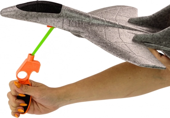 Styroplans jagerfly i gråt design med elastisk affyrer til spændende leg for børn fra 3 år.