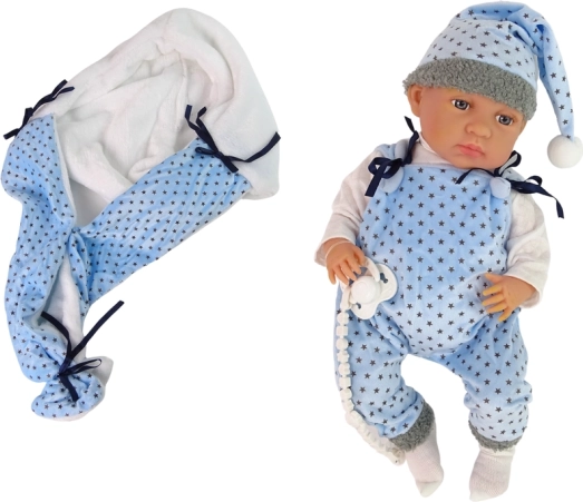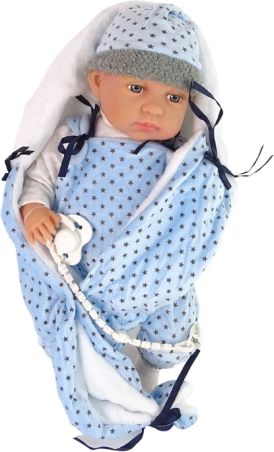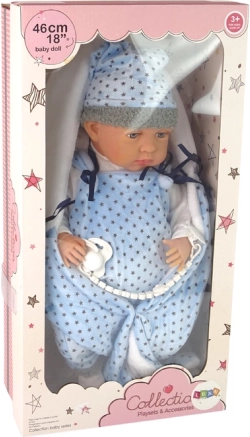 Dukken på 46 cm har et realistisk udseende med bevægelige arme, ben og hoved, hvilket bidrager til en virkelig autentisk legeoplevelse. Bløde og behagelige materialer sikrer, at dukken er rar at røre ved. Barnet kan lege med udskifteligt tøj, da dukken har let udskifteligt tøj. Tøjet omfatter en blå-sort pyjamas og et tæppe i stjernedesign.
