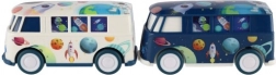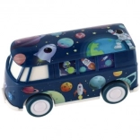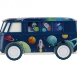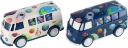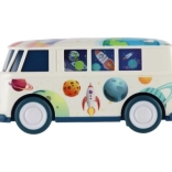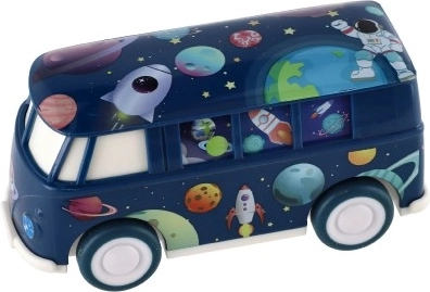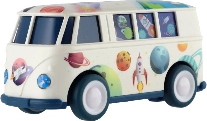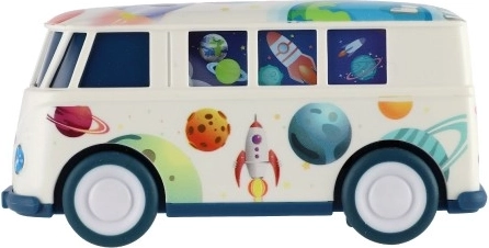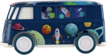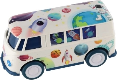Bussen er designet med livlige farver og rum-motiver, som fanger ethvert barns opmærksomhed.