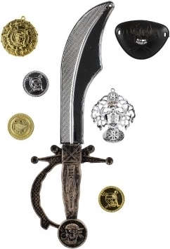 Sættet indeholder et plastsværd, en øjenklap og piratmønter – alt hvad børn behøver for straks at gå på eventyr. Perfekt til kostumer og daglig leg.