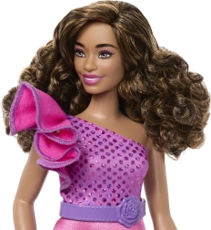 Fejr 65 år med stil med Barbie Fashionistas-dukken, der bringer et moderne twist på det ikoniske look. Hun har en lyserød asymmetrisk kjole med flæse, en glitrende overdel, matchende lyserøde hæle og et lilla blomsterbælte. Ideel til kreativ leg, fantasiudvikling og samlere.