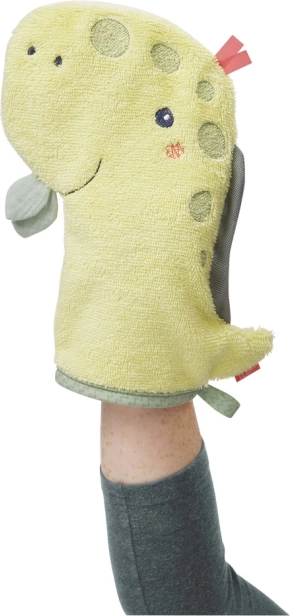 Det venlige udtryk på handsken formet som en dinosaur gør badet til en leg. Børn lader sig nemmere vaske, og hele rutinen bliver mere behagelig takket være det sjove design.