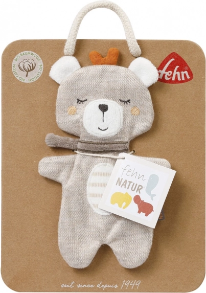 Den strikkede bamsekrop er lavet af økologisk bomuld, og indeni er der knitrepapir, som laver lyd, når man trykker på den. Gribelegetøjet understøtter på legende vis barnets hørelse, greb, berøringssans og finmotorik. Den praktiske størrelse gør det nemt at tage æslet med overalt.
