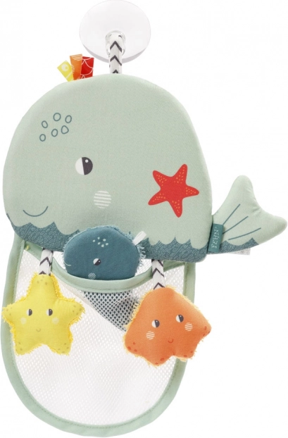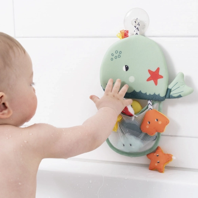 Den praktiske opbevaring i form af en sød hval gør det nemt at holde badeværelset ryddeligt og have badelegetøjet lige ved hånden. Takket være sugekoppen kan hvalen sættes fast på væggen, og de mindre stykker legetøj kan lægges i dens net, hvor de også tørrer på grund af den gode ventilation. Opbevaringen er udstyret med knitrende papir og tre plysdyr med løkke.