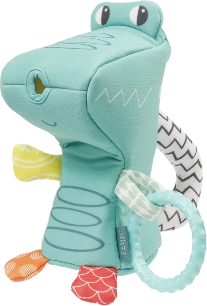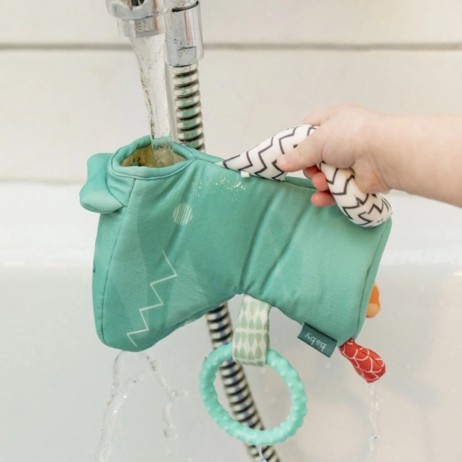 Det ergonomiske tekstilhåndtag er designet til små børnehænder, så legetøjet er let at holde selv i våde omgivelser. Den praktiske ring gør det muligt at fastgøre krokodillen til barnevogn eller autostol og tage den med overalt – på ferie, til poolen og på stranden.