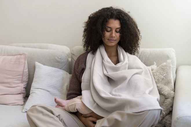 Den multifunktionelle ammetæppe Mom’n Play gør det muligt for dig at amme din baby hvor som helst i fuldstændigt privatliv. Det er lavet af økologisk bomuld, og takket være ringen kan det nemt fastgøres omkring halsen. Ringen er designet, så den også kan bruges som bidering. Tæppet kan bruges til at tørre din babys ansigt eller til at håndtere uforudsete situationer på farten.