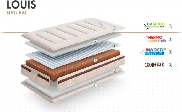 Kernen, fremstillet af kokosfibre, er 100% naturlig og miljøvenlig. Den giver høj åndbarhed og optimal ventilation. Takket være laget Visco Innogel® har madrassen Louis stor tilpasningsevne.