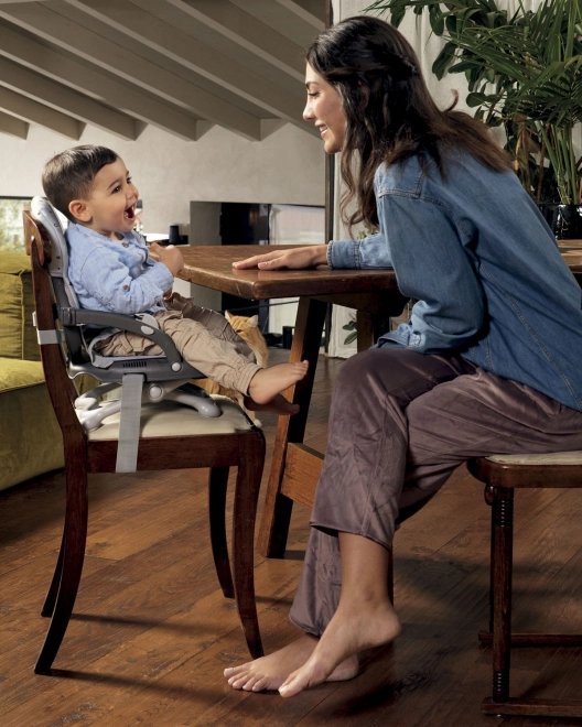 Det universelle fastgørelsessystem med justerbare stropper og skridsikre fødder holder højstolen solidt på plads, og 3-punkts selen beskytter barnet.