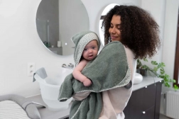 Nyd roligere badetid med hættehåndklædet DOOMOO Dry & Play. Den gennemtænkte fastgørelse med silicone-ring lader forældre klikke håndklædet omkring halsen, have hænderne fri og håndtere babyen komfortabelt og sikkert. Efter badet er det blot at holde babyen ind til sig, så håndklædet straks tørrer og varmer.