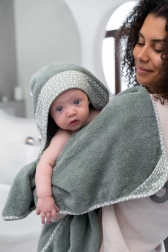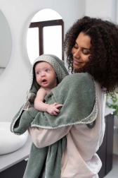 Håndklædet er syet af blød økologisk bomuld, som er skånsom mod sart børnehud. Materialet er absorberende, blødt og behageligt med uafhængig OEKO‑TEX-certificering. Takket være målet 90 × 100 cm er det velegnet fra nyfødt over tumling til større barn.