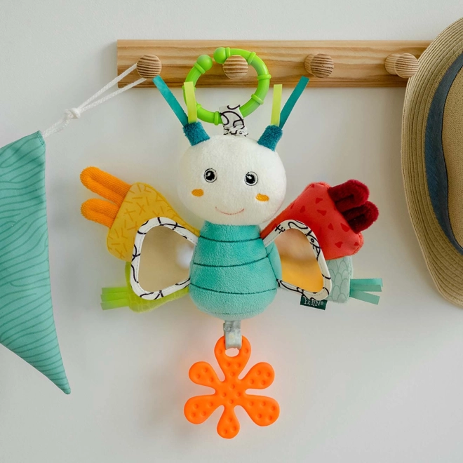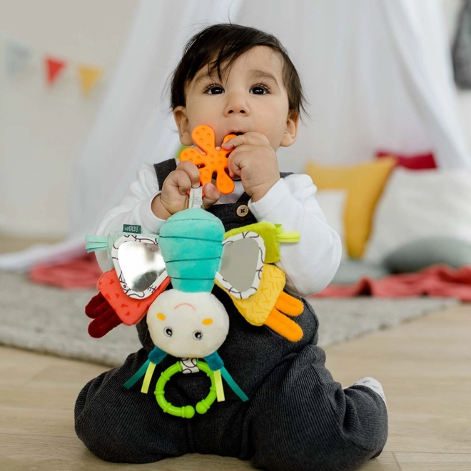 Farverige grebelementer støtter syns-, føle-, gribe- og høresansen, mens den bløde stjerneformede bidering hjælper ved tandfrembrud. Babyer vil træne deres selvtillid ved hjælp af det sikre spejl, og de sjove lyde fra ranglen vil fascinere dem og underholde dem i lang tid.