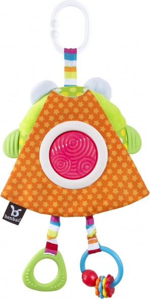 Lyse farver, en sød, blød plysbamse, bånd og rasler vil ikke kun underholde børn, men også udvikle deres psykomotoriske færdigheder. Raslen i maven på det plyssede dyr hjælper barnet med at fokusere og identificere lyde, og de bevægelige dele træner koordinationen “øje-hånd”. Den lette klips, der kan fastgøres til barnevogne, autostole og andet, sikrer, at legetøjet altid vender mod barnet. De plastdele, der bruges, er uden BPA. Velegnet fra fødslen.