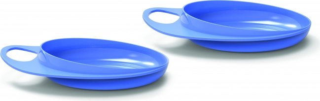 Disse pastelblå tallerkener med forhøjet kant er designet til komfortabel og selvstændig spisning for børn. Den forhøjede kant hjælper med at få maden op med ske, reducerer spild og holder indholdet på tallerkenen. Den ergonomiske ring gør det nemt og sikkert at holde ved både transport og fodring.