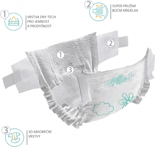 Ultrabløde og åndbare materialer suppleres af superelastiske sidevinger, som tilpasser sig perfekt til hvert af barnets bevægelser. Bleerne er ideelle til beskyttelse både dag og nat, gør hurtig og nem udskiftning let og skåner naturen takket være en bæredygtig produktionsmetode.