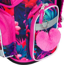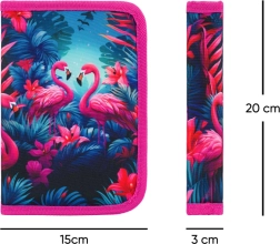 Skoletasken suppleres af et etages penalhus uden indhold og en robust pose med karabinhage til fastgørelse på tasken. Alt i et legende tropisk flamingomotiv.