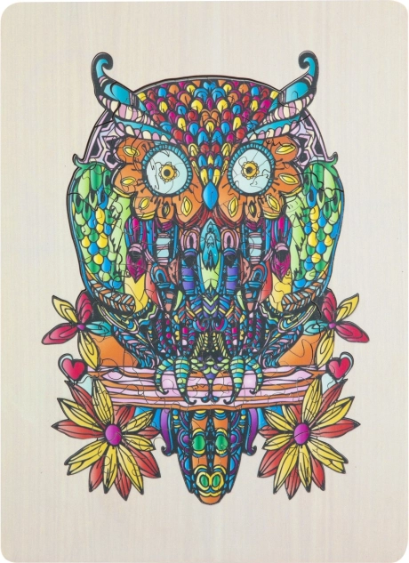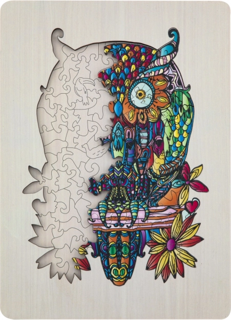 Træpuslespil med uglemotiv er et sjovt legetøj for både børn og voksne. Det indeholder 133 forskelligt formede brikker og en underlagsplade for nemmere samling.