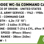 Dodge WC-56 Command Car er en legende blandt militærkøretøjer, som spillede en nøglerolle under Anden Verdenskrig. Denne model i skala 1:35 gengiver autentiske historiske markeringer fra 1944 og har specialbyggesten til det ikoniske kølergitter. Den har roterende hjul med gummidæk og plads til figurer. I pakken findes to figurer inspireret af virkelige historiske personer – en amerikansk general og en militær chauffør.