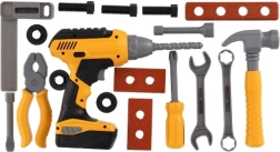 Indeholder en boremaskine, hammer, skruetrækker, tang, skruenøgle og skruer. Ideel til udvikling af motoriske færdigheder og kreativ tænkning.