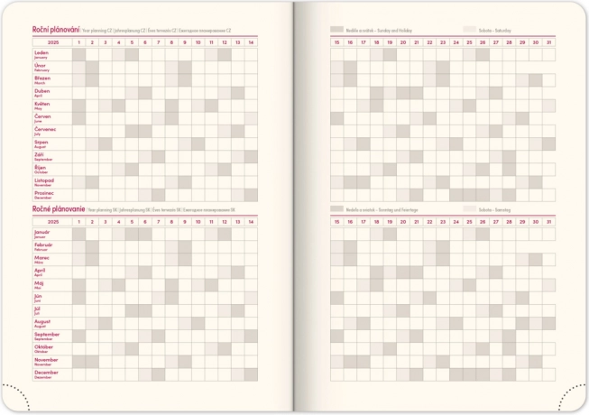 Ugentlig dagbog Notique Twill 2025 i elegant blå-sølv farve er det ideelle værktøj til at organisere dine dage. Tilbyder en overskuelig ugentlig plan med tjekkisk-slovakisk kalender og flersprogede beskrivelser.