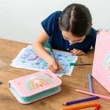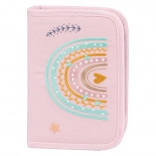Praktisk og moderne penalhus i rosa pastelfarver med regnbuemotiv, der glæder både skoleelever og studerende. Udførelsen med ét lag og to flapper muliggør overskuelig organisering og hurtig adgang til alle nødvendigheder. Holdbare materialer og YKK-lynlås sikrer lang levetid ved daglig brug.