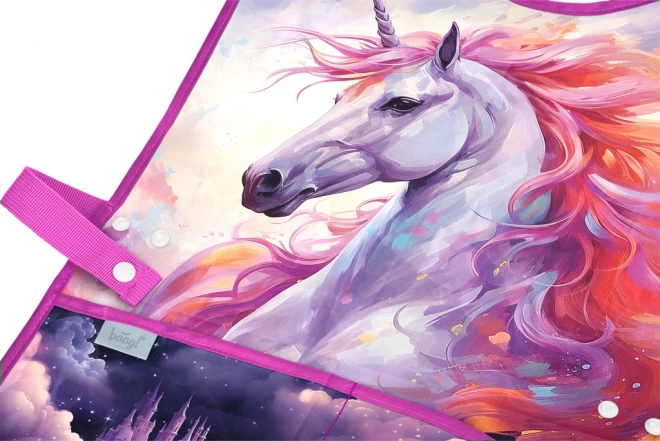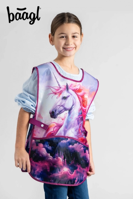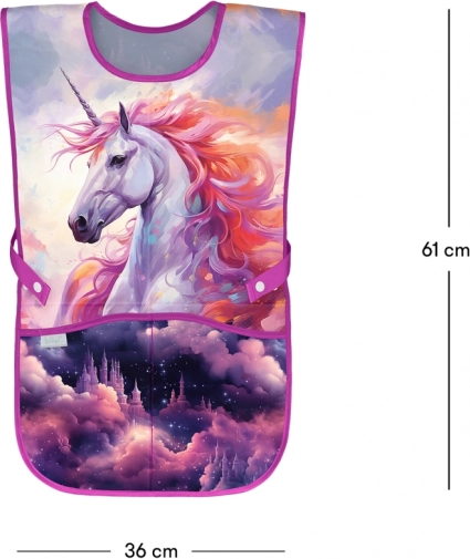 Det stilfulde og funktionelle børneforklæde med motivet Enhjørninge Kongerige fra BAAGL beskytter tøjet under maling, limning og kreativt arbejde. Takket være den let aftørrbare overflade kan det nemt rengøres og er hurtigt klar til nye eventyr.
