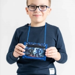 Designet med futuristiske robotter i blå nuancer fanger opmærksomheden med det samme. Den gennemsigtige netdel og de indvendige rum hjælper med at holde kort og id overskueligt organiseret, og snoren gør det muligt at bære pungen komfortabelt om halsen.