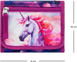 Denne lette pung med et magisk enhjørningemotiv vil glæde enhver barn. Med snoren kan den bæres komfortabelt om halsen, så den altid er ved hånden og samtidig sikker. Det slidstærke tekstilmateriale holder til daglig brug i skolen, til fritidsaktiviteter og på ture.
