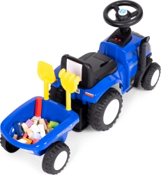 Den blå gåbil traktor med realistisk look og officiel NEW HOLLAND-licens giver børn timevis af aktiv leg inde og ude. Robust plastkonstruktion med metaldele sikrer lang levetid og stabil kørsel, mens traileren udvider lege mulighederne og transport af skatte fra have eller sandkasse.