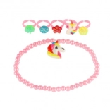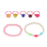 Dette charmerende tilbehørssæt bringer børn glæde gennem farver og fantasi. Plastiske ringe med motiver som hjerter, blomster eller glitrende sten samt elastiske armbånd er lette at tage på og behagelige at have på. Perfekt til udklædning, legehjørner og som en lille gave.