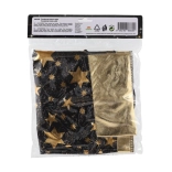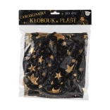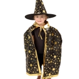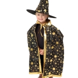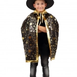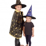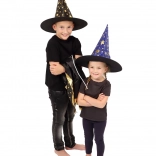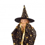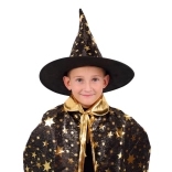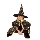 Forvandl dit barn til en lille troldmand. Dette sort‑gyldne sæt med stjerneprint indeholder en markant heksehat og en matchende kappe, som passer perfekt til børnekarneval, maskeballer og halloweenfester. Takket være de lette materialer er det nemt at have på og giver fri bevægelighed under leg og optrædener.