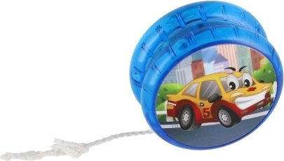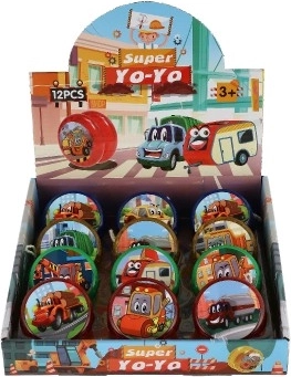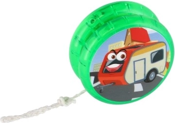 Jojoen fås i flere farver, inklusive blå, rød, grøn og gul, alle med glade billeder af transportmidler.