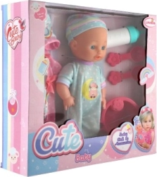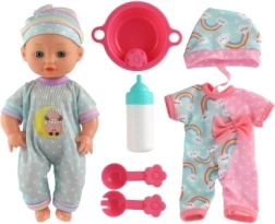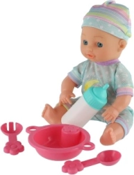I pakken får du et komplet spisesæt med suteflaske, skål, teske og gaffel samt ekstra tøj til omklædning. Leg med dukken udvikler finmotorik, fantasi og lærer børn ansvar på en sjov måde.