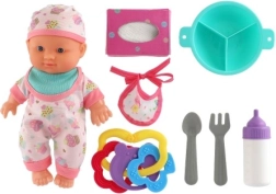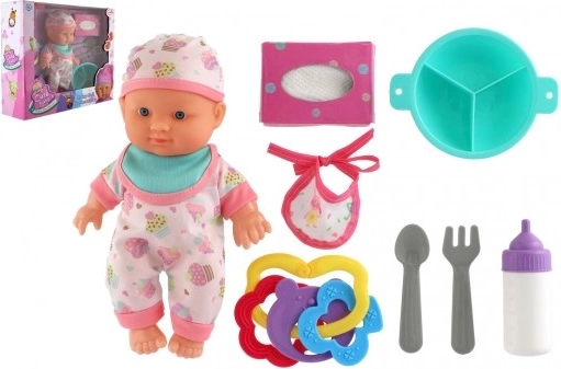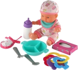 Pakken indeholder en sutteflaske, en rangle, vådservietter og et spisesæt til småbørn, som støtter realistisk leg og udvikler motoriske færdigheder og sociale roller.