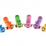 Legetøjet er lavet af holdbar plast med glatte kanter og findes i 6 glade farver. Takket være den kompakte længde på 13 cm passer den i barnets hånd og rygsæk og er ideel både hjemme og på farten.