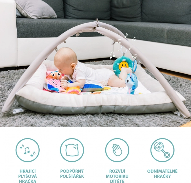 Interaktivt legetæppe til babyer tilbyder det perfekte rum til udvikling af motoriske færdigheder og leg. Plyslegetøj understøtter koordination og greb.