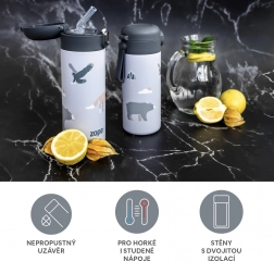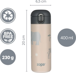 Designtermoflasken på 400 ml er den ideelle følgesvend på enhver rejse. Takket være kvalitets lufttæt låg og dobbelt lag af rustfrit stål holder den dine drikkevarer ved perfekt temperatur i lang tid. Dit barn kan dermed nyde sin yndlingsdrik, uanset hvor de tager hen.
