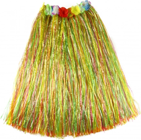 En fantastisk nederdel i "Hawaii"-stil må ikke mangle i nogen kvindes garderobe! Dette skønne stykke er det ideelle tilbehør til fastelavn eller til den typiske hawaiianske dans "HULA". Nederdelen, 72 cm lang, er lavet af tynde plastikstrimler i forskellige farver og pyntet med farverige blomsterblade. Perfekt! Bliv stjernen til karnevalsfesten med denne hawaiiske nederdel, eller skab et helt hawaiiansk kostume! Pakken indeholder kun nederdelen.