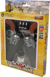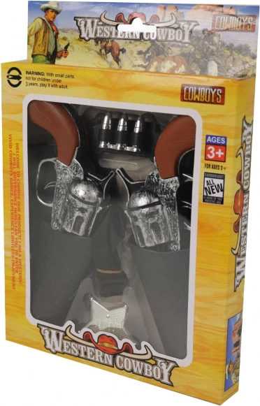 Sættet er pakket i en pap-plast emballage med western-grafik, ideelt som gave til enhver lille pistolmand.