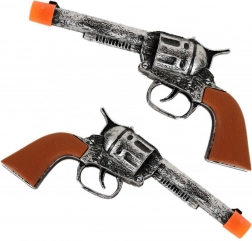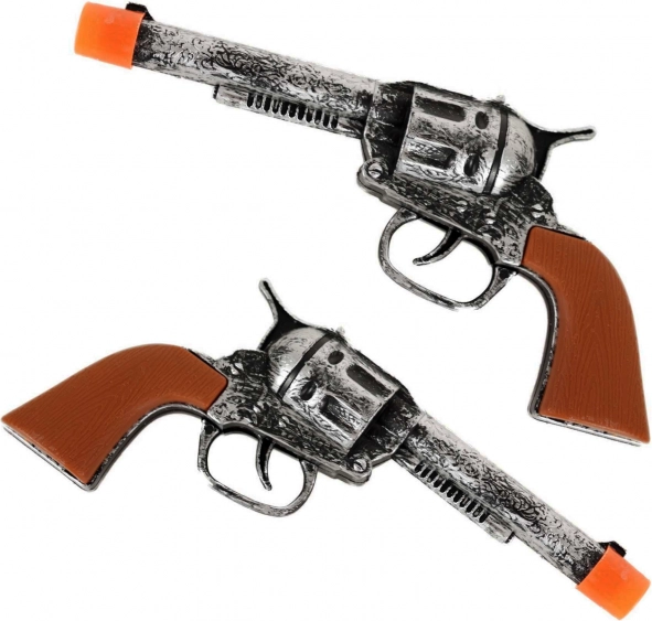 Pistolerne har sølvfarvede kroppe med brune greb og markante prægninger, der giver et autentisk look.