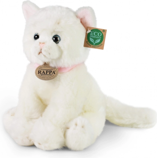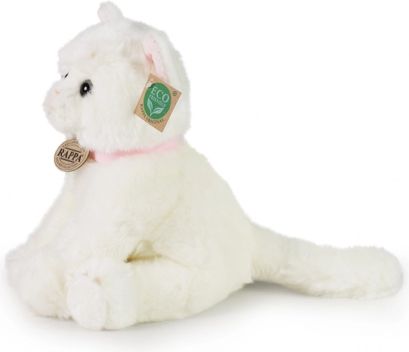 Vi præsenterer den fortryllende plyskat fra RAPPA, fremstillet med fokus på detaljer og hensyn til naturen. Denne hvide kat er udstyret med et lyserødt halsbånd, som fremhæver dens naturlighed og legesyge.