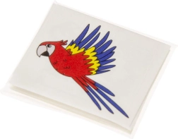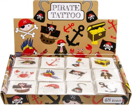 Pakke indeholder 12 forskellige typer tatoveringer med pirattema, hver tatovering på et separat kort, med grafisk vejledning inkluderet. Kun køb i hele pakker á 48 stk.