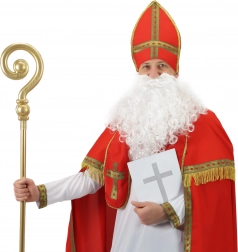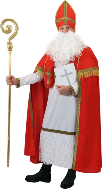 - Nikolaus-hue, hvidt klæde, rød kappe med krave, skulderbånd med kors