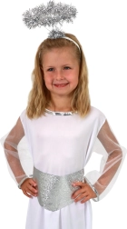 Den sølvfarvede glorie på hårbøjle giver kostumet et autentisk touch og understreger det samlede engleindtryk.