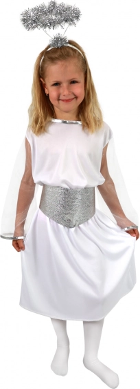 Dette børnekostume som engel er designet til behagelig brug og et imponerende udtryk. Den fine tekstilkjole i hvid klæder enhver lille fe, mens gennemsigtige ærmer og sølvdetaljer giver en festlig effekt. Medfølgende er også glorie på hårbøjle, som fuldender outfittet perfekt.