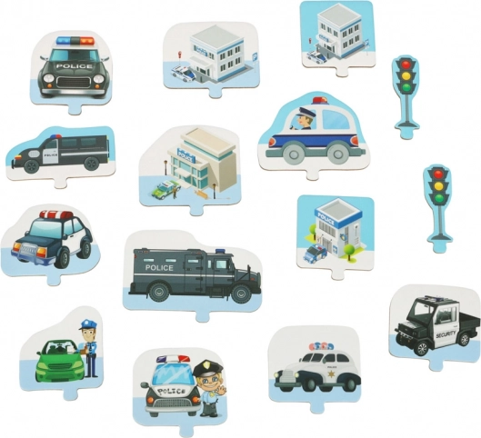 Dette unikke puslespil giver dine børn mulighed for at bygge deres eget politiby. 38 puslespilsbrikker gør det muligt at skabe et netværk af snoede gader, hvor børnene kan køre rundt med politibiler og holde orden. Sættet indeholder også specialdele, som frit kan placeres på baser for at skabe nye infrastrukturelementer.