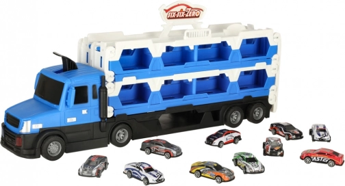 Sammenklappelig lastbil – autotransporter med racerbane, 10 små biler, blå